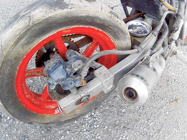 このエイプは初期型のキャブ仕様で、前後ブレーキ&ホイールはNSR50のものが移植されています。