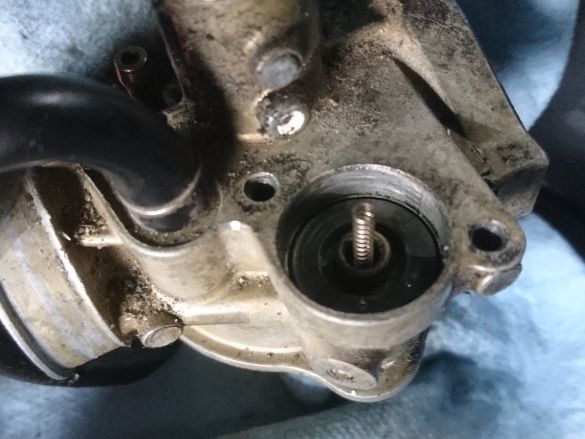 キャブを分解してみると、燃料の詰まりなどなく綺麗でした・・・が、オートチョークのニードル部分が固着して抜けません。