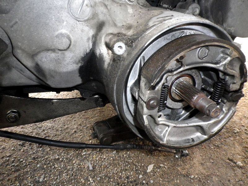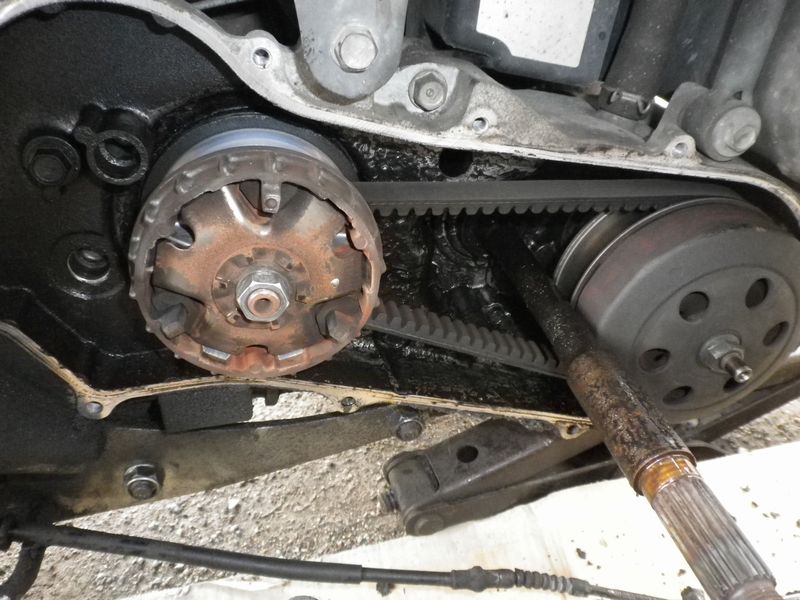 プーリーはもちろん、ベルトやクラッチ、ブレーキシューまでオイル漬けです。