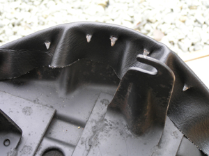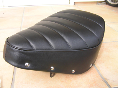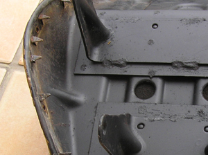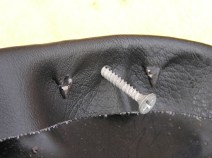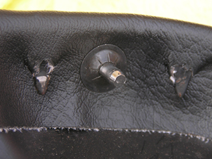 マイナスドライバーやペンチを使って鋲を取り外します。次にシート表皮を留めている△状のピンを起こして表皮を外します。※ドライバーが滑りやすいので、手に突き刺さらないよう注意! 表皮を取り去ったら△ピンを整えて新しい表皮を取り付けます。