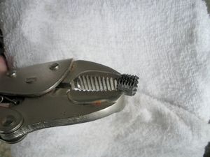 実際作業を始めてみると手で摘んだ状態では作業が捗らないので、試行錯誤の末バイスプライヤーで挟んで目立てしました。力も適度に入って効率よくネジが修正されていきます(^^)