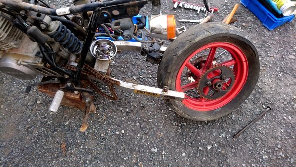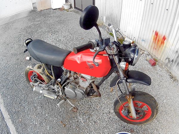 このエイプは初期型のキャブ仕様で、前後ブレーキ&ホイールはNSR50のものが移植されています。